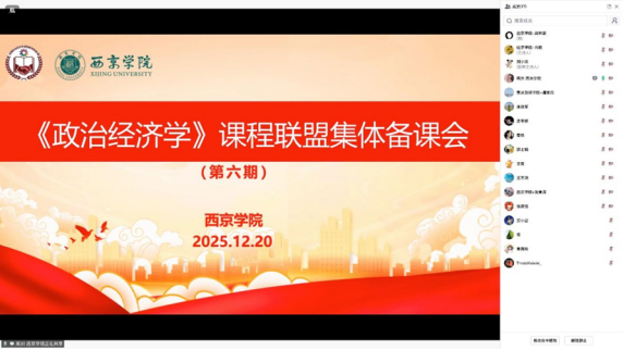 2025年12月20日下午,西京学院主办的全国政治经济学教学联盟第六期线上集体备课会圆满落幕。会议以《马克思主义政治经济学概论》(第二版)“第六章 资本的流通”为核心,汇聚南开大学、天津大学等10余所高校专家...
