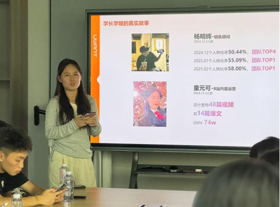 “学长学姐分享”环节成了现场最具温情的互动环节。于西安维帆,2021级校友杨明辉(任职销售顾问岗)、童元可(任职B站内容运营岗)结合自身经历,分享了入职后的实际工作内容以及成长收获,并向新生传达了“主动学习、多实践”的建议。其坦言:“期望学弟学妹们珍惜在校的每一次实践机会,多尝试、多提问。”
