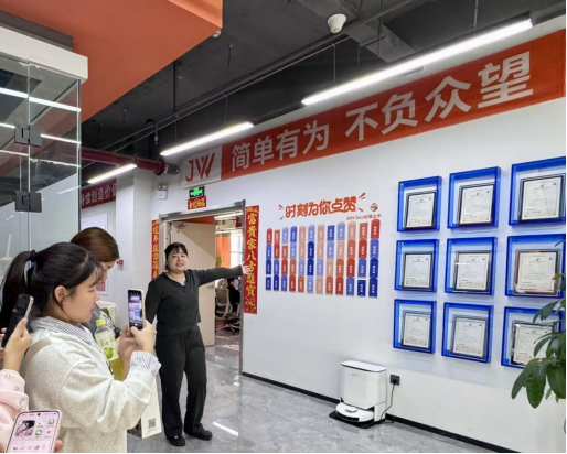 师生走进企业办公区,观察开放式工位与项目组讨论区布局,通过数据看板、项目进度表和团队讨论场景,感受电商企业以项目为导向、高效协作的扁平化管理模式;参观专业化直播间,观摩主播与助播配合讲解商品、演示技巧,运营团队紧盯流量数据调整投放策略的工作状态;期间,企业通过文化墙展示和负责人讲解,介绍自身发展历程与核心文化,让新生初步感知电商企业组织基因与运营内核。
