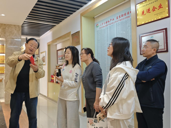 参观结束后,调研团与企业负责人开展了座谈交流。刘子贤基于多年创业经验,分享了企业在品牌建设以及网络营销过程中所遭遇的困难与相关思考。他指出,企业正在积极推动数字化转型,期望通过与高校开展合作,引入新媒体传播和电子商务专业的创新理念,提升“府州红”品牌的市场影响力。