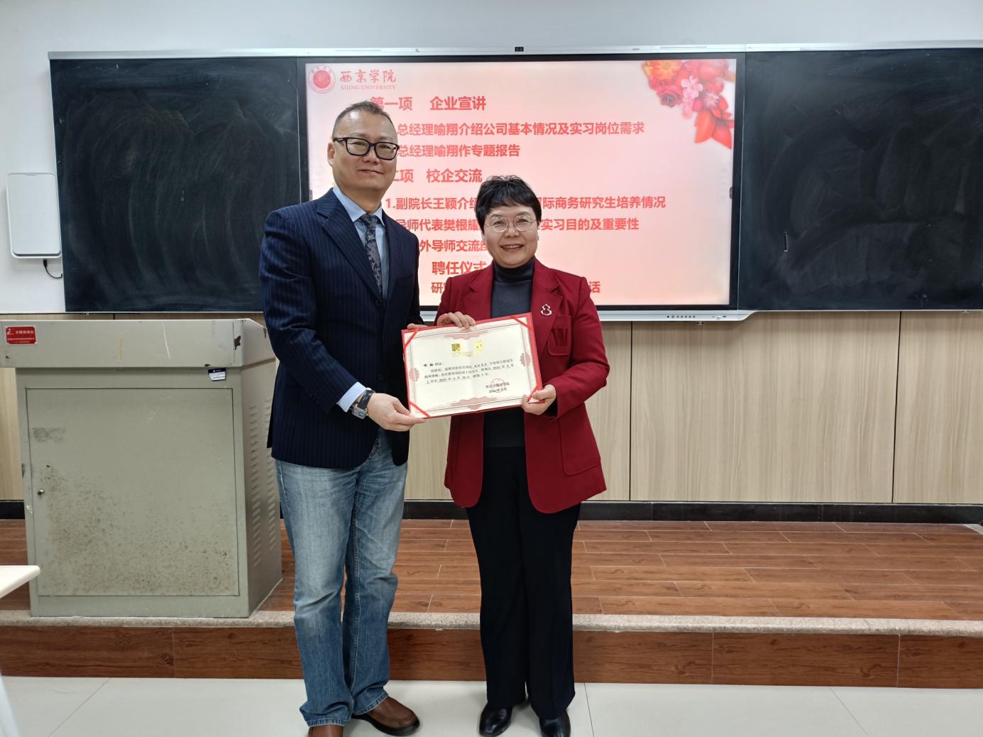 聘任仪式上,喻翔正式受聘为商学院国际商务硕士研究生首位企业导师,标志着学院校外导师队伍建设迈出坚实一步,也为“双导师制”的落地生根注入实质动能。