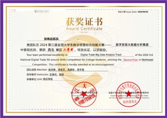 7. 2024—2025年荣获全国大学生数字贸易大数据分析大赛西北赛区二等奖;