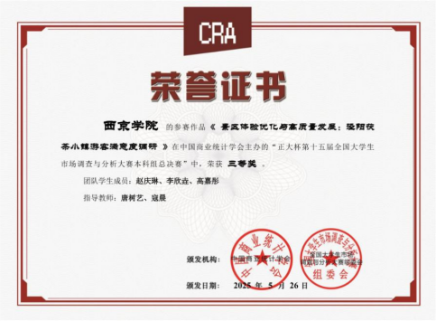 3. 2024—2025年荣获正大杯第十五届全国大学生市场调查与分析大赛本科组总决赛国家三等奖;