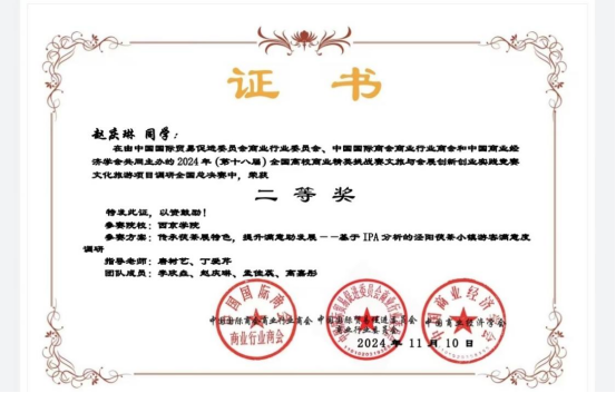 2. 2024—2025年荣获全国高校商业精英挑战赛文旅与会员创新创业实践竞赛全国总决赛二等奖;