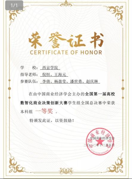 1. 2022—2023年荣获全国第一届高校数智化商业决策创新大赛全国总决赛本科组一等奖;