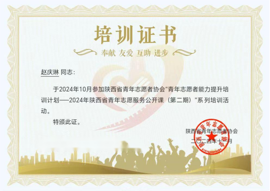 8. 2024年荣获陕西省青年志愿者能力提升培训计划结业证书。