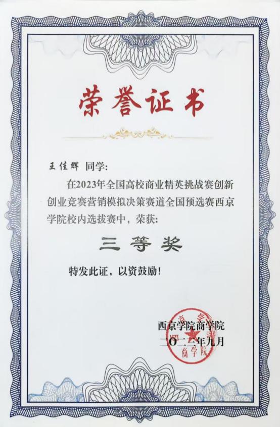 3. 2023年9月荣获:“2023年全国高校商业精英挑战赛创新创业竞赛营销模拟决策赛道西京选拔赛“三等奖”;