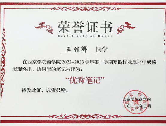 1. 2023年3月荣获:西京学院商学院2022—2023学年第一学期寒假作业展评“优秀笔记”;