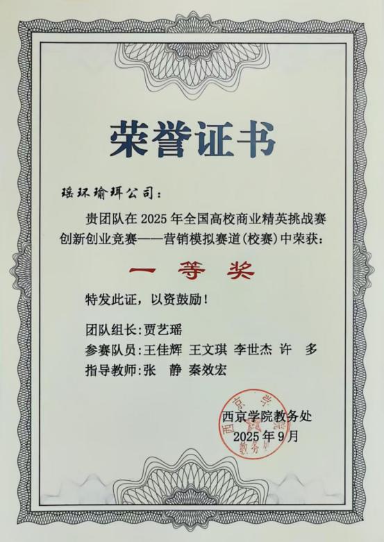 9. 2025年9月荣获:2025年全国高校商业精英挑战赛创新创业竞赛营销模拟赛道(校赛)“一等奖”。