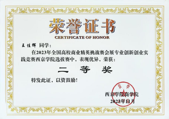 2. 2023年9月荣获:2023年全国高校商业精英挑战赛西京选拔赛会展专业创新创业实践“二等奖”;