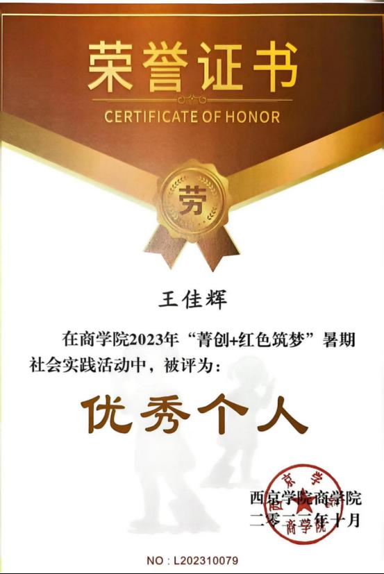 4. 2023年10月荣获:西京学院商学院2023年“菁创+红色筑梦”暑期社会实践活动“优秀个人”;