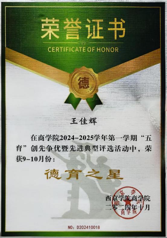 6. 2024年10月荣获:西京学院商学院“五育”创先争优暨先进典型评选活动“德育之星”;