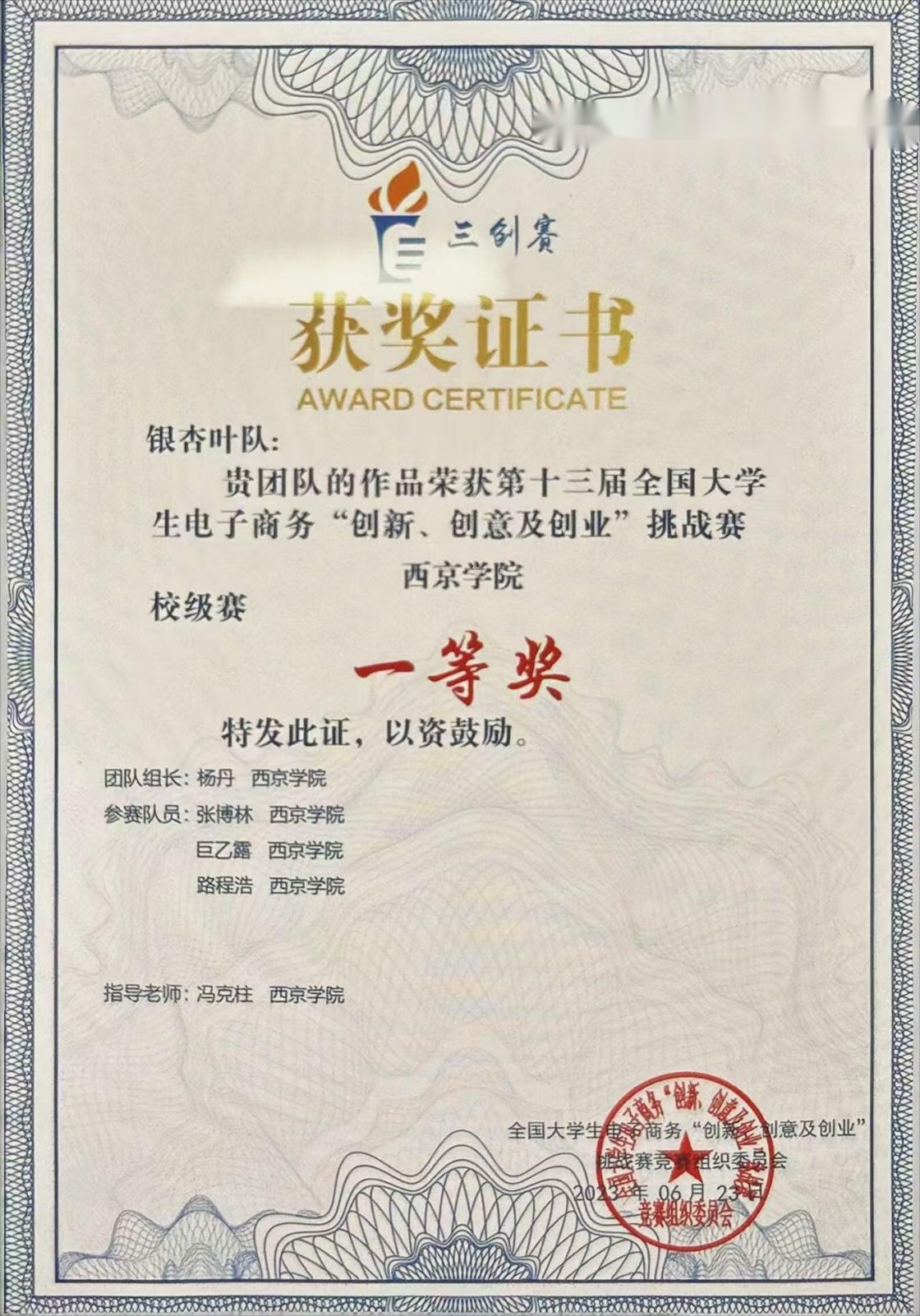 6.2023年6月荣获第十三届全国大学生电子商务“创新、创意及创业”挑战赛西京学院校级赛“一等奖”;