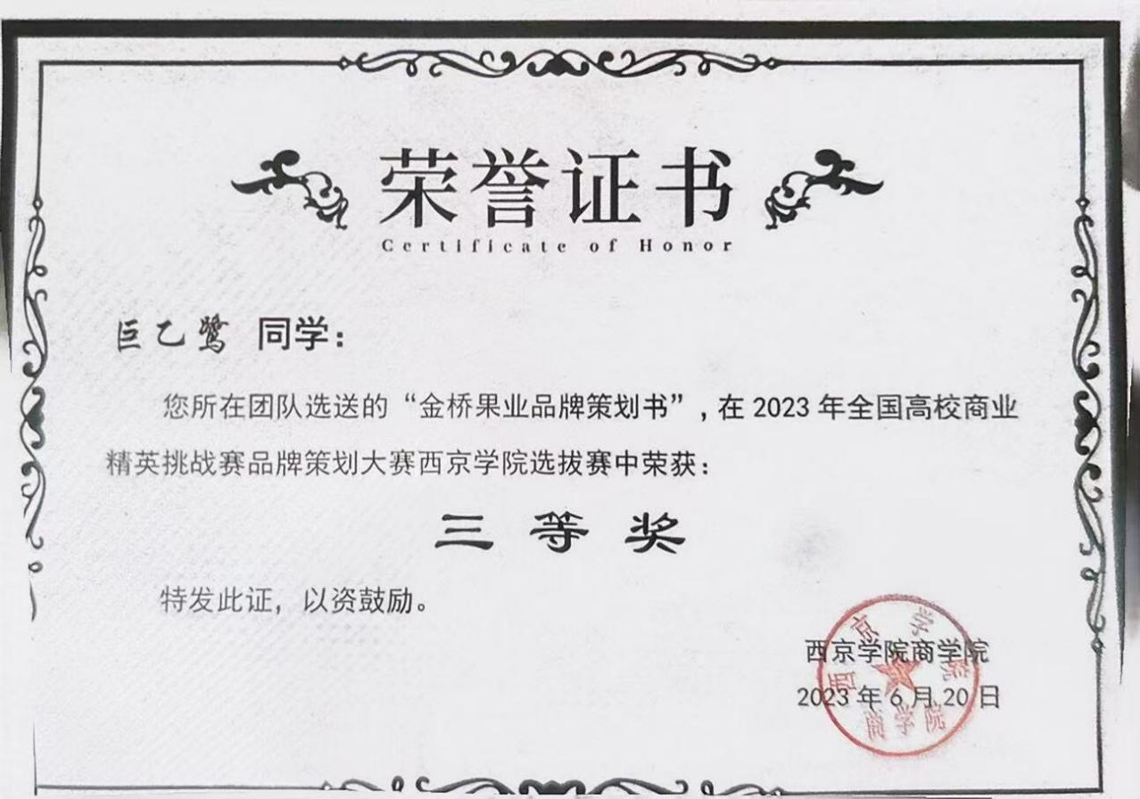 7.2023年6月获得2023年全国高校商业精英挑战赛品牌策划大赛西京学院选拔赛“三等奖”;