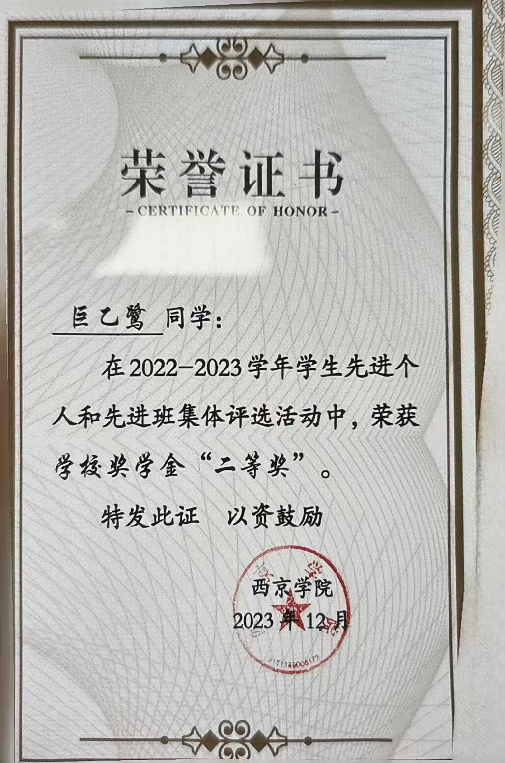 9.2023年12月荣获2022-2023学年校奖学金“二等奖”;