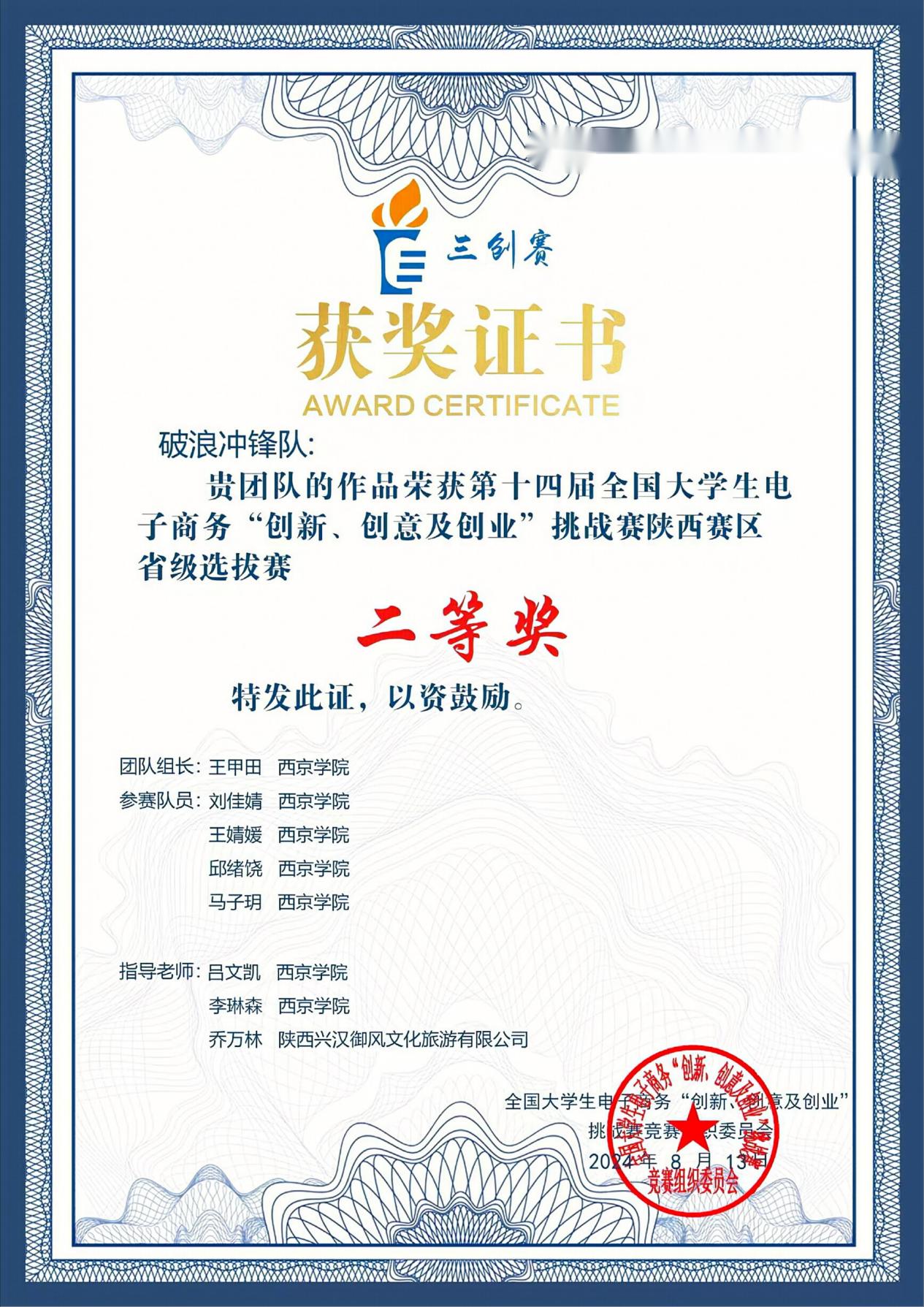 6.2024年8月荣获:第十四届全国大学生电子商务“创新、创意及创业”挑战赛陕西省赛区“二等奖”;