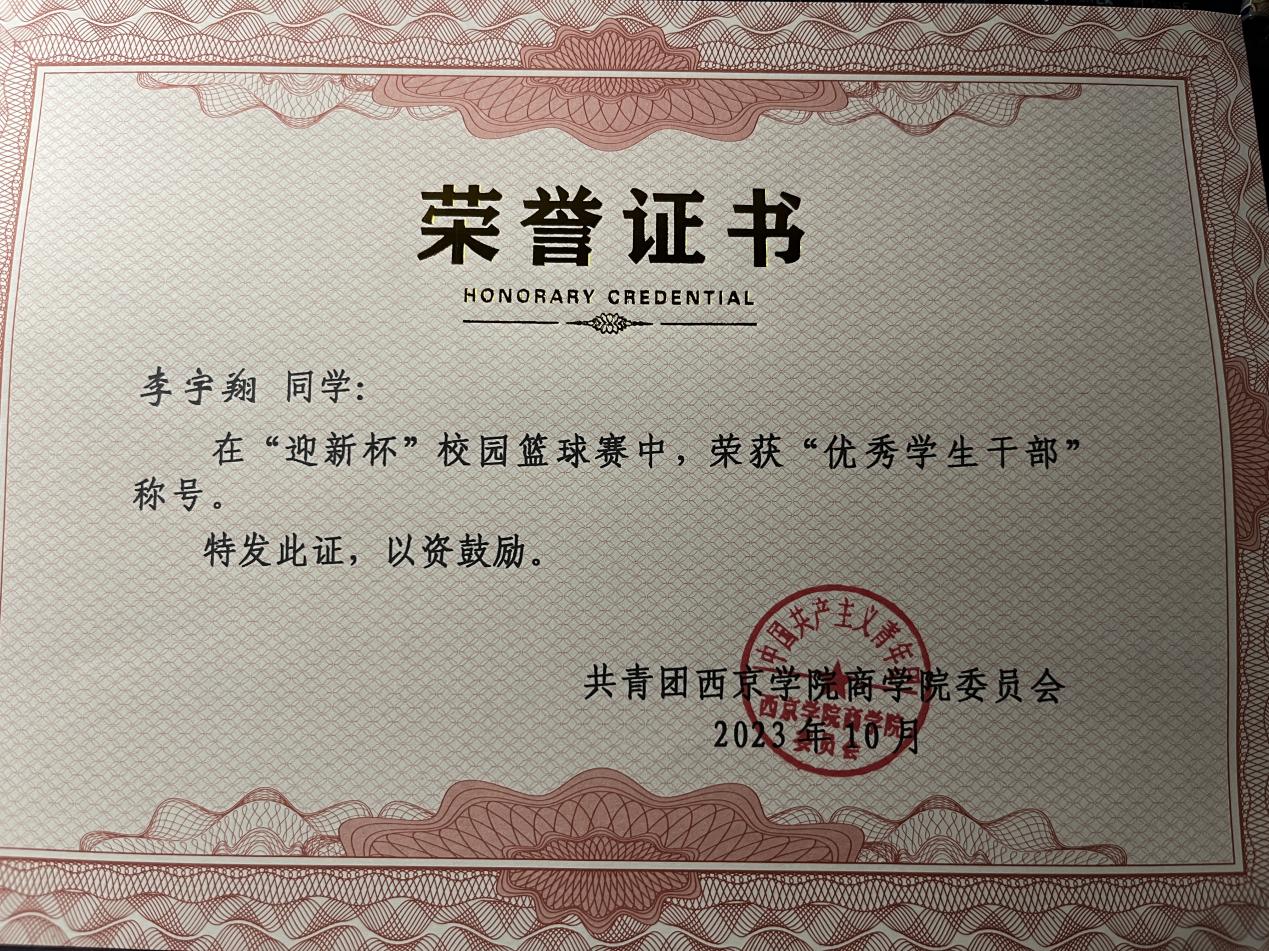 2.2023年10月在迎新杯比赛中荣获“优秀学生干部”称号;