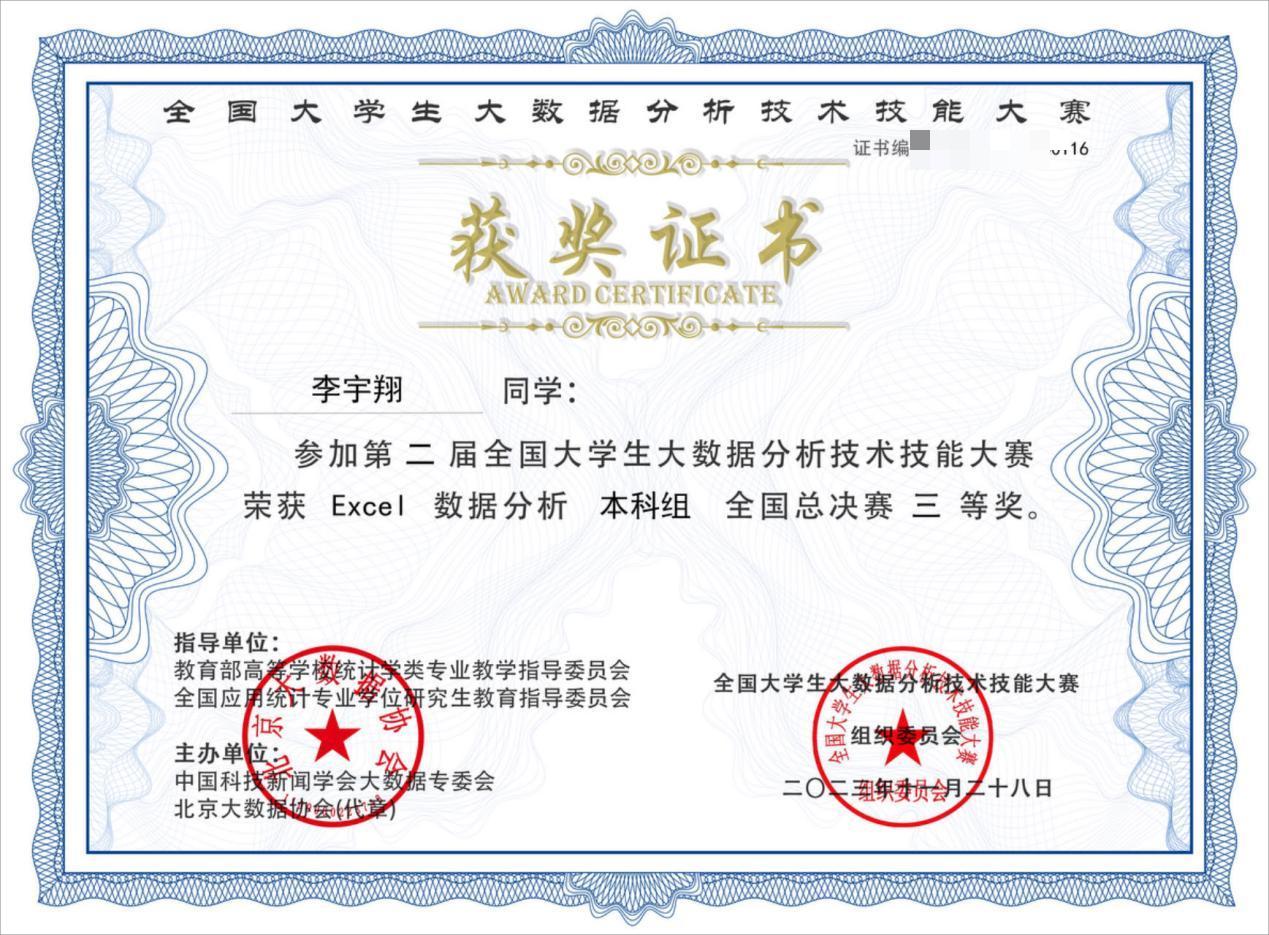 5.2023年11月荣获第二届全国大学生大数据分析技术技能大赛国家级三等奖;