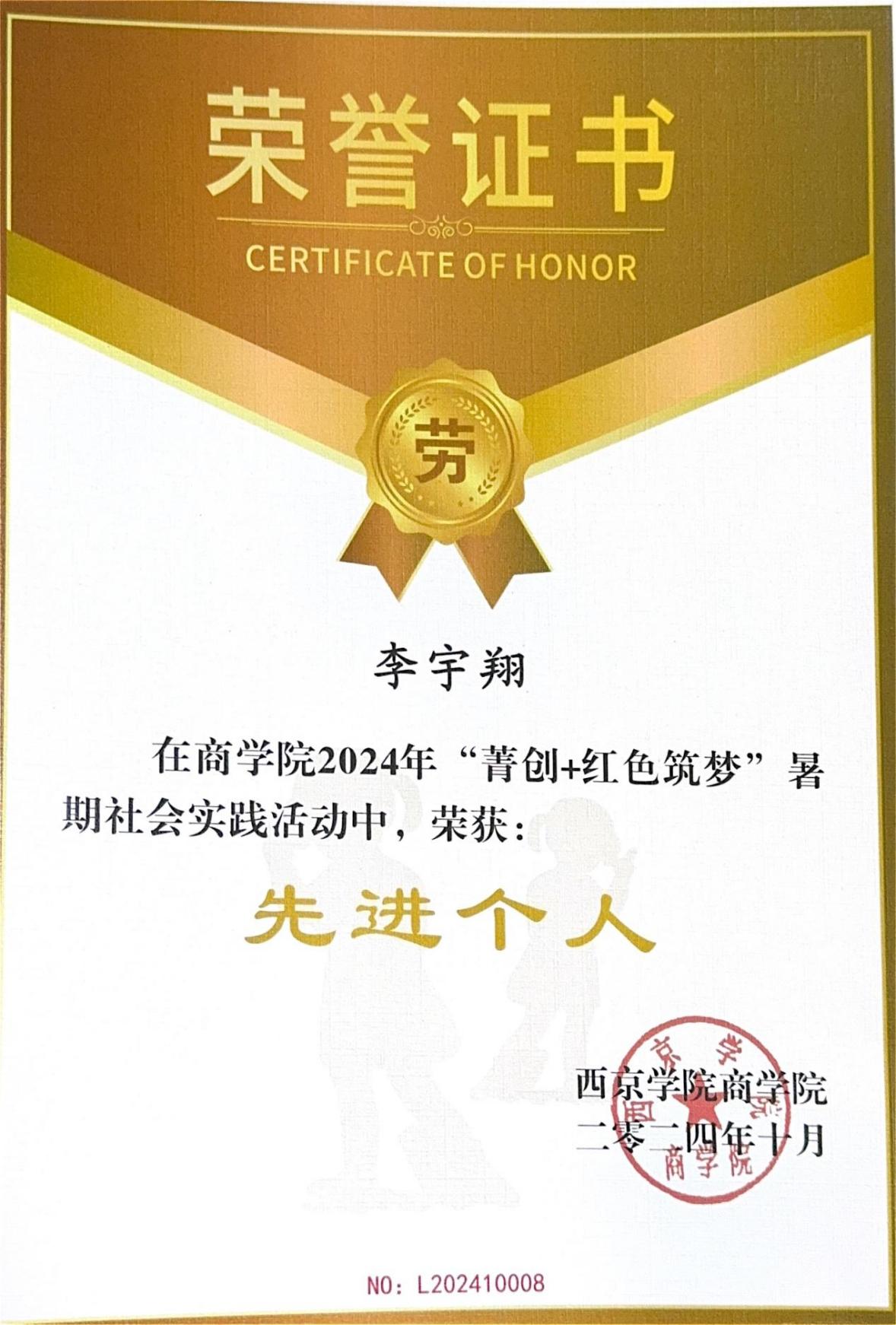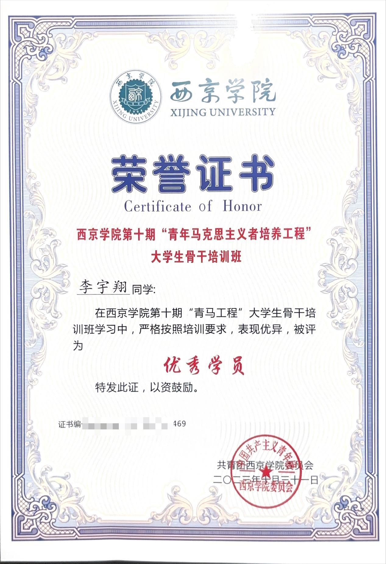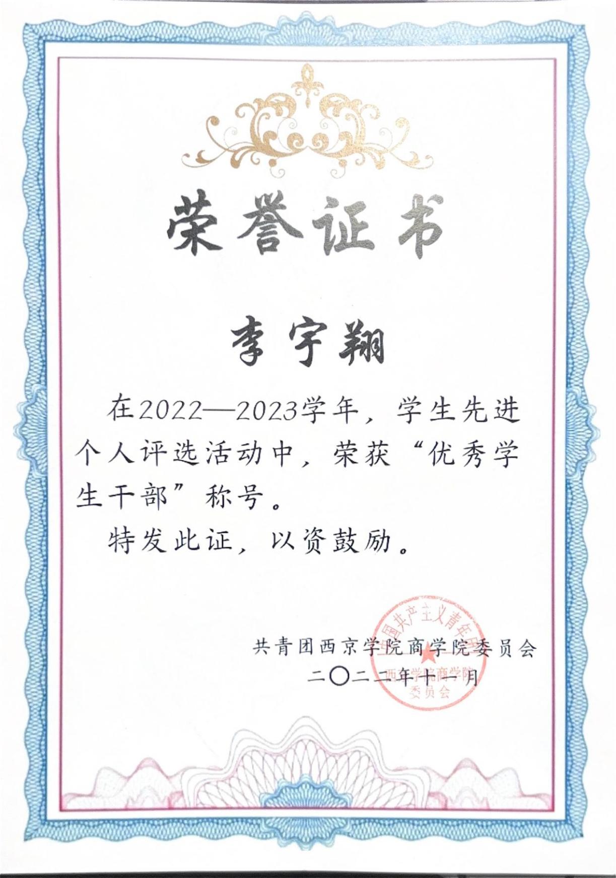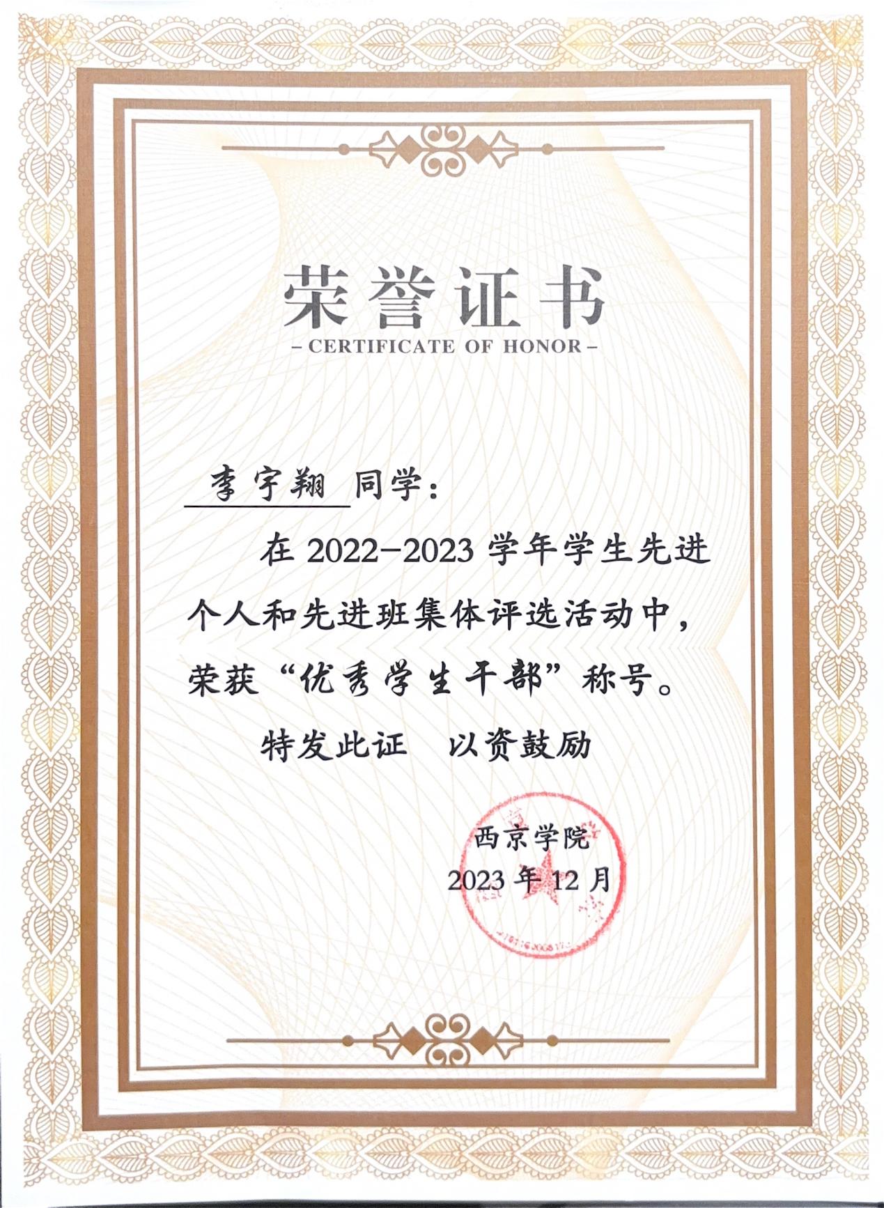 6.2023年12月荣获西京学院2022-2023学年“优秀学生干部”称号;